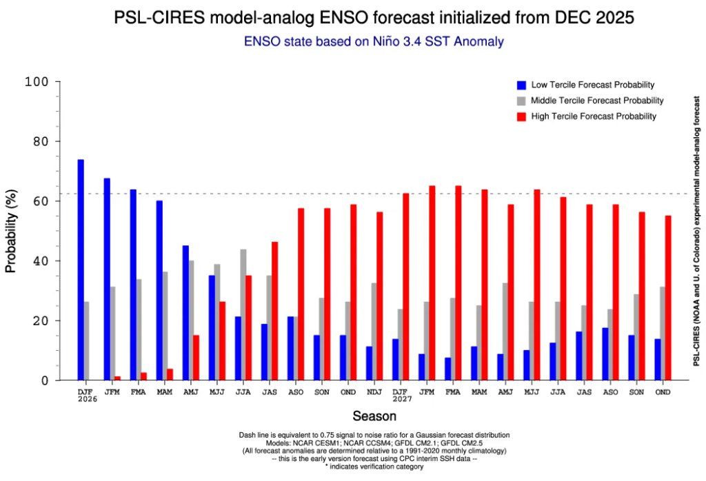 从天气展望来看,2026年夏季厄尔尼诺概率较高,并持续至冬季