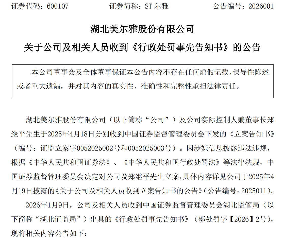 1月9日晚间,ST尔雅(600107)公告称收到湖北证监局的《行政处罚事先告知书》。因涉及关联方非经营性资金占用且未及时披露,公司及多名责任人被处以罚款,合计970万元。