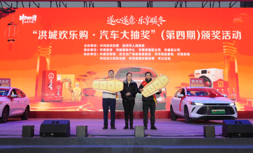 1月16日,四川遂宁射洪市子昂广场,“洪城欢乐购·汽车大抽奖”第四期抽奖活动拉开帷幕,现场抽汽车、抽家电、抽舍得大礼包。同时,千人汤锅宴、精彩演出与特产展销活动同步开启,现场氛围嗨到炸。